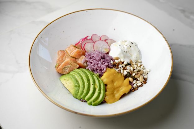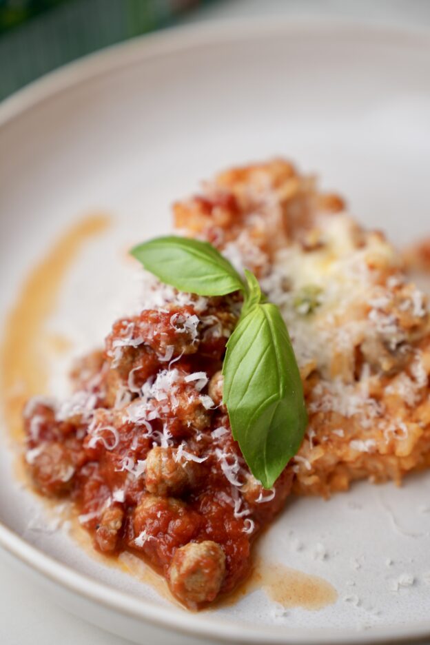 Aggiungete una spolverata finale di noce moscata e guarnite con noci tostate, semi di girasole, uvetta e foglie di prezzemolo.