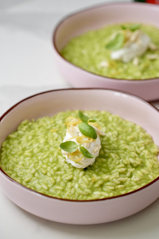 Servite subito il risotto ben caldo, completandolo con qualche goccia di pesto.
