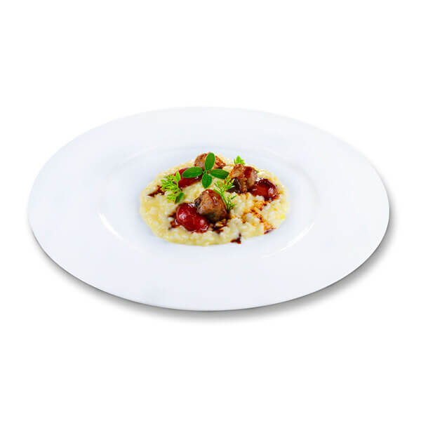 Published 20 Dicembre 2022 at 600 × 600 in Giovanni Di Pirro – Riso Gallo Gran Riserva alle susine caramellate, animelle di vitello glassate e grué di cacao.