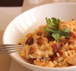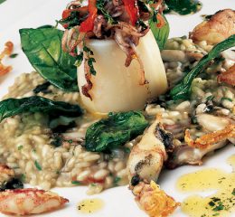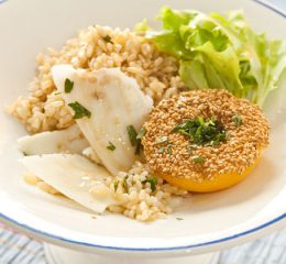 Versare il riso ai 3 cereali in una padella con qualche goccia d’olio e bagnare poco per volta con il brodo caldo, terminare la cottura per circa 2 minuti, lasciando asciugare bene il brodo. Togliere dal calore e mantecare con il pecorino, ed il pepe nero. Stendere il riso ai 3 cereali su dei piatti lisci, mettere sopra la gelatina di birra, e terminare con una grattugiata di mandorle salate.