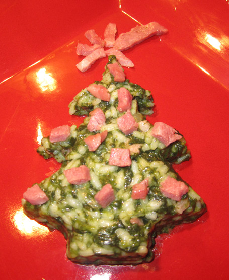 Preparazione del riso: unire il riso con gli spinaci e il guanciale col suo sughetto. Decorare quindi secondo la propria fantasia.
