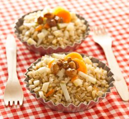 Rivestite i gusci di pane grattugiato con il riso mantecato all’olio extravergine d’oliva, adagiate al centro il ragù di crostacei e capovolgete sul piatto.