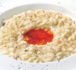 Scaldate la crema di piselli e conditela con sale e pepe e versatela nel piatto dove precedentemente avrete composto la forma di riso anch’esso condito con olio e sale.