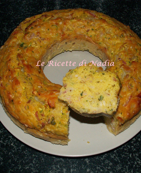 Preparazione degli ingredienti per la ciambella di riso: lessare il riso in abbondante acqua bollente salata. Scolarlo e lasciarlo raffreddare. Lavare e grattugiare le zucchine. Tagliare la mozzarella a dadini, il prosciutto cotto in listarelle. e i pomodori secchi in pezzetti. Con l’aiuto di una frusta, lavorare le uova con l’olio e il latte. Aggiungere il parmigiano grattugiato e, poco per volta, la farina mescolata al lievito. Si deve ottenere un composto liscio e omogeneo. Aggiungere le zucchine, i pomodori, la mozzarella, il prosciutto e qualche pizzico di sale. In ultimo, il riso freddo.