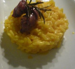 Mettere in cottura il farro: farlo rosolare in olio e coprirlo con il brodo di carne, e cuocerlo come un normale risotto. A cottura quasi ultimata aggiungere un cucchiaio abbondante di curry e un pizzico di sale, e mantecare con dell’olio a crudo così da renderlo cremoso. Nel frattempo tagliare a fettine la cipolla, farla rosolare in olio, e aggiungere le verdure tagliate a tocchetti (carote e zucchine); unire i capperi, i pinoli, i pomodori secchi e le olive. Unire anche la polpa ricavata dalle costine d’agnello, aggiungere sale, pepe, brodo e un cucchiaio di pomodoro per renderlo rosato. Impiattare e servire, guarnendo con un ciuffetto di finocchietto selvatico.