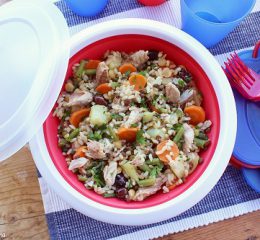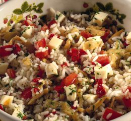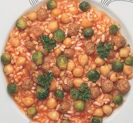 In una casseruola tostate i cereali senza grasso, bagnate con il brodo e portate a cottura. Mantecate con olio d’oliva, frullate 1/5 di questo risotto e mescolatelo al resto. Stendete il risotto in una teglia allo spessore di 1 cm, raffreddate e tagliate con uno stampino circolare di 7 cm di diametro. Rosolate in padella antiaderente unta d’olio da entrambi i lati e tenete al caldo. In un’altra padella rosolate le code di scampi con i cipollotti freschi tagliati sottilmente. Versate in una fondina il sugo alla busera agiate sopra la galletta di riso e guarnite con le code di scampi e i cipollotti.