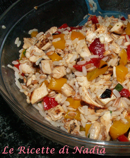 Preparazione dell’insalata di riso: pulire e lavare i peperoni. Tagliare il petto di pollo in strisce, non troppo sottili. Grigiare peperoni e pollo su una piastra molto calda.