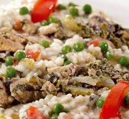 Aggiungere i piselli scolati dal liquido di conservazione. Tagliare i peperoni a dadini e unirli al riso, tenendo da parte alcune strisce per decorare.
