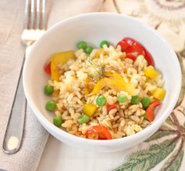 Preparazione dell’insalata di riso e ceci: cuocere il Riso Gallo Blond Integrale in abbondante acqua salata per 14 minuti. Scolare e raffreddare sotto acqua corrente fredda. Trasferire il riso in una ciotola e condire con il succo di mezzo limone e 2 cucchiai di olio.