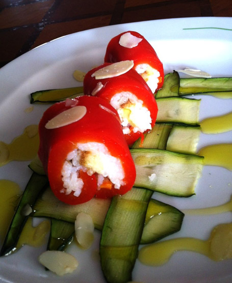 Preparazione del sushi: iniziamo a preparare il nostro sushi. Incidiamo il peperone per lungo e lo apriamo a formare un letto dove iniziamo a mettere il nostro riso, qualche bocconcino di tacchino, qualche pezzettino di zucchina sminuzzata e nel centro ci mettiamo il panettone.