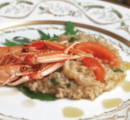 Affettare sottile il pesce e disporlo ordinatamente su un piatto freddo. Ripetere l’operazione per i 4 piatti. Preparare con l’insalatina 4 bouquet e appoggiarli in mezzo al piatto. Mettere i 4 involtini di riso al centro del coque e condire il tutto con una emulsione di olio, succo di limone, sale e pepe.