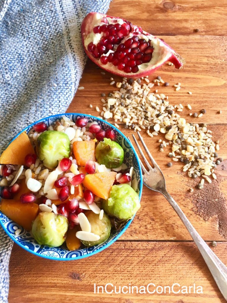 Pulire la zucca eliminando la buccia e i filamenti, tagliarla a fettine sottili e non troppo grandi. Pulire i cavolini di Bruxelles eliminando le foglie più esterne, lavarli e tagliarli a metà. Mettere in una padella anche aderente un paio di cucchiai d’olio, uno spicchio d’aglio aggiungere quindi le verdure e cuocere a fuoco abbastanza vivace per circa 10-12 minuti in modo che rimangano abbastanza croccanti, salare eliminare lo spicchio d’aglio e togliere dal fuoco. Cuocere il mix di cereali e legumi in abbondante acqua salata, scolare secondo i tempi di cottura dopo 14 o 16 minuti, metterlo quindi in una terrina, condire con un paio di cucchiai d’olio, uniree la zucca e i cavolini di Bruxelles e mescolare. Aggiungere i chicchi di melograno, servire nei piatti e distribuire sopra le scaglie di mandorle.