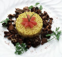 A cottura ultimata incorporare le fettine di salame e le listarelle di cotica. Pepare il riso e fagioli ottenuto e salare a piacere.