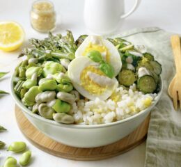 In un piatto da portata mettiamo il riso formando una base omogenea.