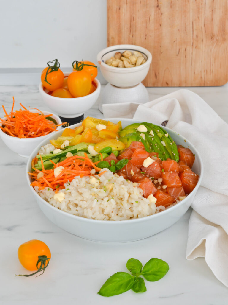 Sistemiamo in ordine orario le carote, il cetriolo, i pomodori, l’avocado, il salmone ed al centro aggiungiamo le edamame. Distribuiamo sopra i semi di sesamo tostati, la granella di anacardi, l’erba cipollina sminuzzata ed un filo di olio extra vergine di oliva.