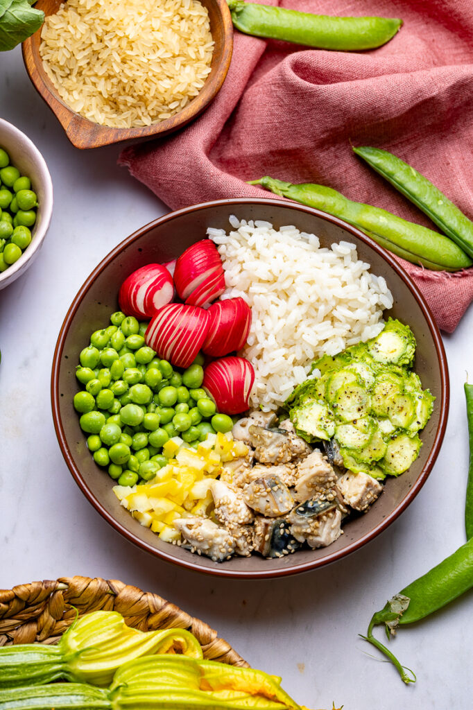 Suddividete gli ingredienti in due ciotole, disponendoli a raggiera e avendo cura di tenerli ben distinti gli uni dagli altri. Completate con una macinata di pepe sulle zucchine e una spolverata di sesamo sullo sgombro e servite.