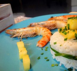 Per accompagnare questo delizioso piatto ho scelto il riso Basmati Gallo, un riso a chicchi lunghi e graziosi, profumatissimo, trovo si sposi meglio con questi sapori esotici, ti porta subito lontano. L’ho cucinato semplice, al vapore, proprio come fanno alle Hawaii. Nel frattempo ho messo il polpo a bollire, ho tagliato a nastri il cetriolo, a fettine l’avocado, ho unito la rucola e ho condito il tutto con succo di lime, un cucchiaino di salsa di soia, pochissimo olio di sesamo.