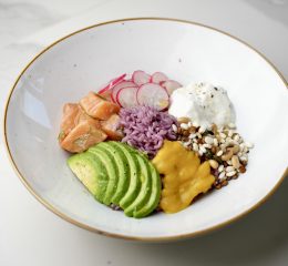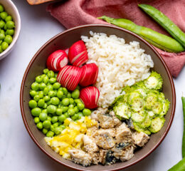 Metti il riso tiepido o freddo diviso in due ciotole, aggiungi i peperoni, le olive e la feta, un po’ di origano e qualche fogliolina di menta.