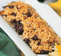 Poggiamo i pomodori e li guarniamo con le fette di mandorla, schiacciandole un poco sul riso per farle aderire, ed un filo di olio.