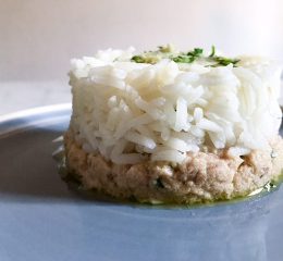 Servire il risi e bisi ponendo sopra i cubi di fegato d’oca e irrorare con la salsa.