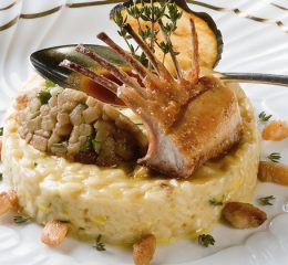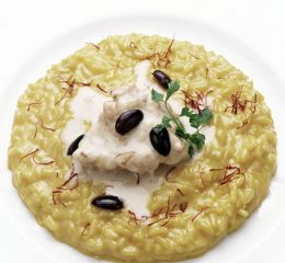 Preparazione del riso agli asparagi: preparate un fondo di pesce con le lische di luccioperca e portatelo a bollore. Lavate gli asperagi e pelateli, quindi sguscuate le fave. Fate scaldare dell’olio in una casseruola, poi unite il riso Carnaroli e fatelo tostare. Sfumate con il vino, lasciate evaporare, quindi bagnate piano piano con il brodo e il fondo di pesce bollenti rimestando.
