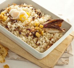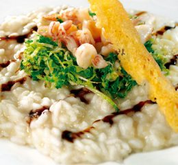 Nel frattempo in un padellino saltare con olio extra vergine e poco aglio le code dei gamberi. Mantecare il riso con il burro restante, il grana e il prezzemolo.
