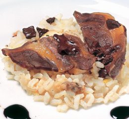 Preparazione del riso ai funghi: imbiondire il sedano, la carota e metà della cipolla tritata con olio, aggiungervi i gusci dei gamberi e fiammare con il brandy e vino bianco, ridurre, poi aggiungere il pomodoro a pezzetti e cuocere per 20 minuti, infine passare il tutto al chinoise per ottenere l’essenza di pomodoro.