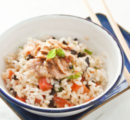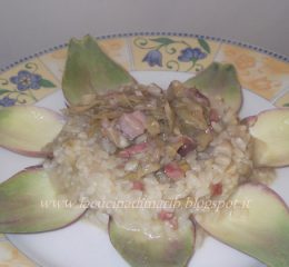 Preparazione del riso: fate scaldare un po’ di olio in una padella quindi aggiungete la cipolla a pezzetti. Fatela rosolare nell’olio aggiungendo, se necessario, un filo di acqua per farla appassire senza bruciare. Aggiungete quindi il riso e fatelo tostare; nel frattempo portate a bollore il brodo vegetale (o di dado). Quando il riso è tostato aggiungete un po’ di brodo vegetale. Proseguite la cottura aggiungendo il brodo via via che si ritira.