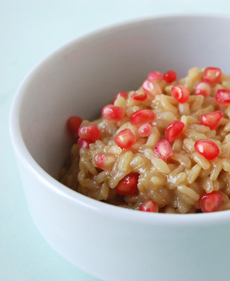 Preparazione della salsa: nel frattempo aprite il melograno. Mettete da parte un po’ di chicchi per la guarnizione. Spremete il melograno rimanente con uno spremi-agrumi o uno schiaccia-patate. Tenete da parte il succo di melograno. Quando il riso è quasi cotto aggiungete il succo di melograno e regolate di sale se necessario. Mescolate bene per far amalgamare il succo al riso.