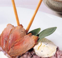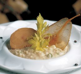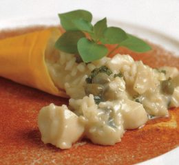 Preparazione del riso all’arancia: passate le carote alla centrifuga, portate a bollore il succo di carote, separate il carotene che affiorerà in superficie e conservate il succo a parte. Montate il burro con il carotene e riponete in frigorifero. Lavate le arance, tagliate la scorza a julienne, sbianchitela per tre volte in abbondante acqua, scolate lasciando poca acqua di cottura, aggiungete lo zucchero e il succo d’arancia ridotto di due terzi. Cuocete a fuoco lento sino a che le scorze saranno candite.