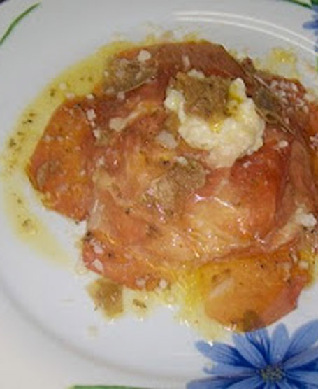 Servirlo al centro del piatto (possibilmente caldo) e coprirlo con 3 fette di Culatello per ogni piatto.