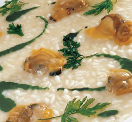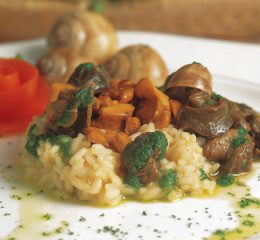 Incorporare il riso Carnaroli e tostarlo, sfumare con il vino e deglassare con il brandy. Continuare la cottura rimestando ed aggiungendo di tanto in tanto un mestolo di brodo bollente.