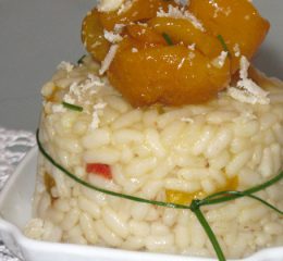 A cottura ultimata, mantecare il Riso Gallo Vialone Nano del Pavese con il burro rimasto, con il Calvados e con il parmigiano-reggiano.