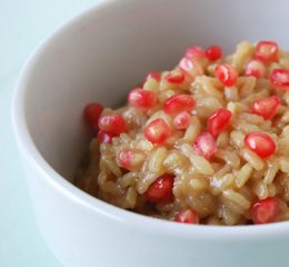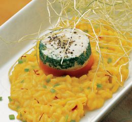 Presentate il riso con capesante su di un piatto precedentemente spolverato con la farina di pistacchi, adagiatevi sopra le capesante e guarnite con alcun pistacchi al sale, un filo di olio di pistacchi e qualche fogliolina di maggiorana.