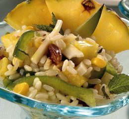 Preparazione del riso Carnaroli all’aragosta: in un tegame di rame soffriggere lentamente nel burro lo scalogno. Aggiungere il riso Carnaroli lasciandolo tostare leggermente. Versare metà champagne e far evaporare.