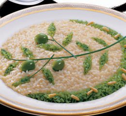 Nel frattempo spennellate con il tuorlo leggermente sbattuto un lato dei filetti di branzino, e impanate la parte con l’uovo con farina a cui avrete mescolato i pinoli. Scaldate poco olio in una padella, unite il pesce e friggete fino a quando i pinoli non sono dorati. Aromatizzate il fumetto con il timo e cuocete finché non si riduce di 1/3, quindi aggiungete il burro e frullate. Quando il riso Carnaroli è pronto, aggiungete un trito di menta e prezzemolo, aggiustate di sale e pepe, unite le vongole e mantecatelo con una piccola quantità di composto al burro e timo. Servite il risotto nei piatti di portata ponendovi sopra una fetta di branzino e gli asparagi velocemente sbollentati. Disponete attorno il burro al timo e decorate con qualche fogliolina di menta.