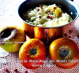 Preparazione del riso Carnaroli: per preparare la salsa mettere il trito di una cipolla e mezzo in un tegame con olio, farlo dorare, aggiungere un rametto di rosmarino, sale, pepe, la barbabietola cotta (darà un bel colore alla crema), un mestolo di brodo e fare cuocere per 10 minuti.