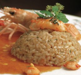 Unite il riso con funghi, lasciatelo tostare, poi aggiungete poco per volta il brodo bollente e dopo 5 minuti gli scalogni. Portate a cottura il risotto e mantecatelo fuori dal fuoco con il Parmigiano. Trasferite il riso nei piatti di portata disponendogli sopra i finferli e un saltimbocca di triglia, quindi nappate con il sugo di vitello. Il vostro riso con funghi è pronto per essere servito e gustato.