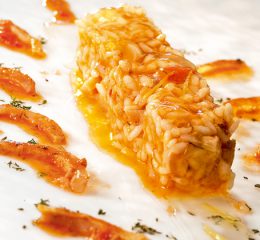 Mettere il Riso con gamberi di Sanremo e mirtilli nei piatti decorandolo al centro con i finferli e con una testa di gambero.