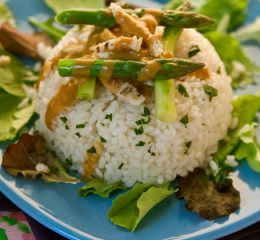Preparazione dell’insalata in accompagnamento al riso: preparate l’insalatina con le mele tagliate a julienne senza togliere la buccia, e il sedano e le scorze entrambi ridotti a julienne. Condite con il succo di arancia, coprite e tenete da parte al fresco.