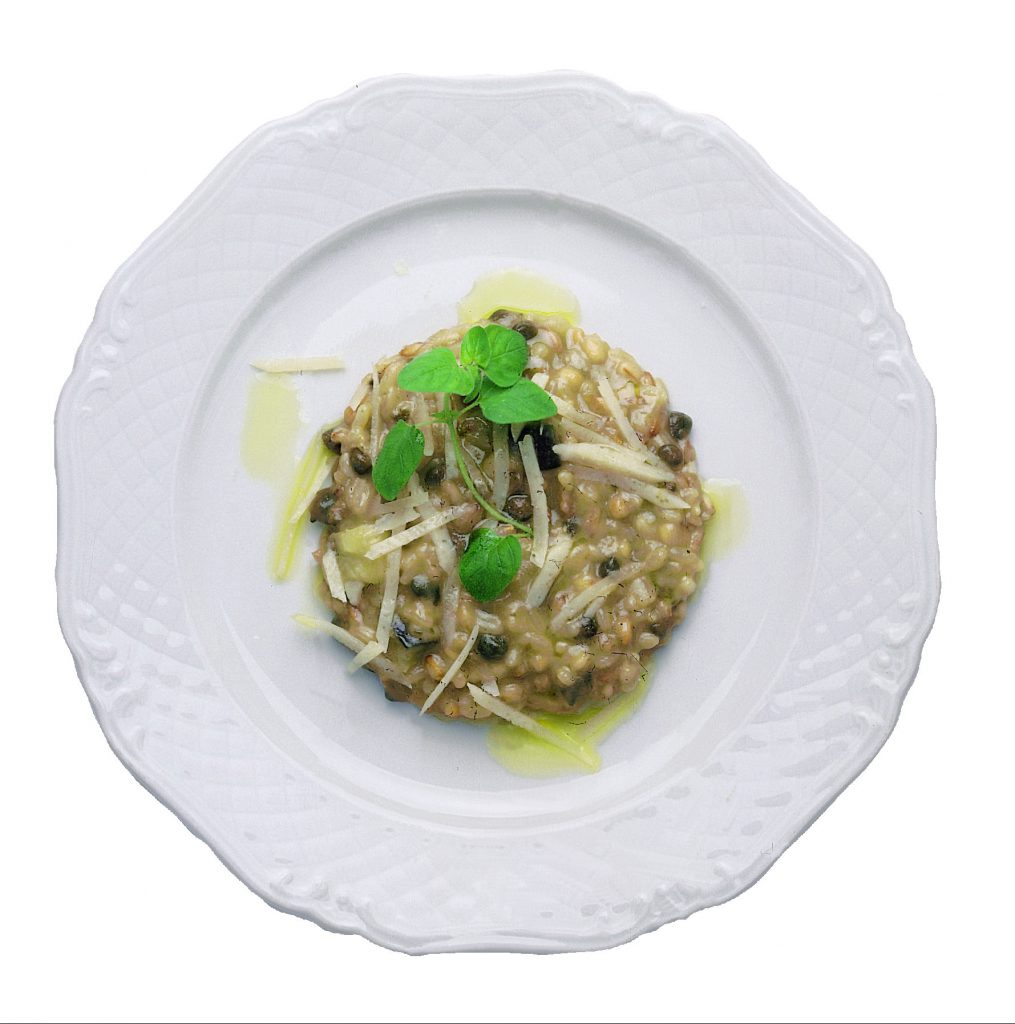 Mantecare il riso con ragù di melanzane con olio, pecorino e una spolverata di origano.