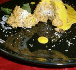 Servire il riso al tartufo guarnendo i piatti con 2 fette di fegato grasso.
