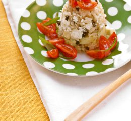 Dorare di nuovo il branzino e disporlo sul piatto con uno stampino disporre il Riso Gallo 3 Cereali ponendo sopra al branzino i carciofi e i porri croccanti.