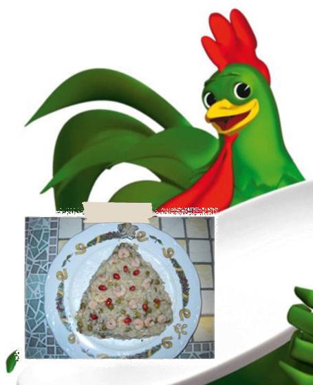 Decora il piatto dando al riso la forma di un abete e addobbalo con gamberetti e granuli di melograno.