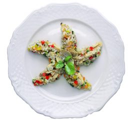 Ripartire il riso integrale nei piatti i crostacei, versare la salsa dei cannellini e il Riso Gallo 3 Cereali Riso Integrale, Avena e Kamut, rifinire con un filo d’olio e il basilico tritato.