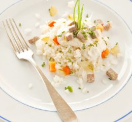Mantecare il Riso Gallo Arborio del Pavese con il burro rimasto, il Parmigiano-Reggiano grattugiato, mescolare bene e lasciare riposare un paio di minuti prima di servire. Il riso dovrà risultare molto fluido e cremoso, ‘all’onda’.