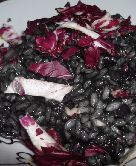 Scolare il riso e versarlo nella padella col condimento, mescolando bene, affinchè il riso prenda un bel colore uniforme. Spegnere il fuoco, versare nei piatti e cospargere di radicchio fresco.