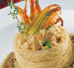 Suddividere il riso zucca e gamberi nei piatti e decorare ogni piatto con un gambero fritto.