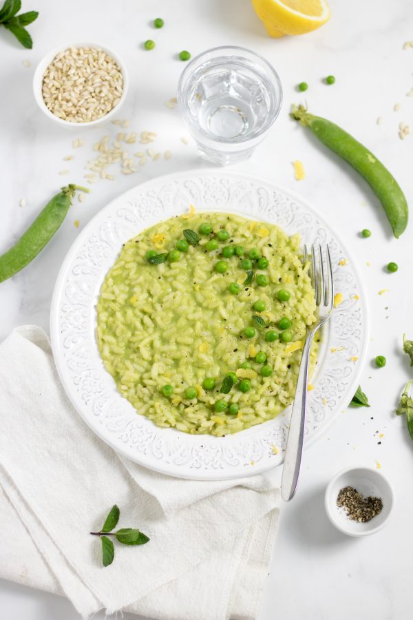 Scaldare un pentolino di acqua salata. Tuffare i piselli e cuocerli per 5 minuti, finché morbidi. Scolarli e versarli in una ciotola con acqua e ghiaccio per raffreddarli. Preparare la crema di piselli: lasciare da parte un cucchiaio di piselli per decorare i piatti, poi versare gli altri in un boccale alto insieme alle foglie di un rametto di menta e due cucchiai di succo di limone. Iniziare a frullare con il mixer a immersione, aggiungendo olio extravergine a filo fino a formare una crema. Ora, preparare il risotto. Tritare finemente lo scalogno e lasciarlo appassire in una pentola con 2 cucchiai di olio extravergine di oliva. Quando lo scalogno è trasparente, aggiungere il riso. Lasciarlo tostare un paio di minuti a fuoco medio, poi versare un mestolo di brodo vegetale caldo e lasciare assorbire. Continuare la cottura del risotto per circa 15 minuti in tutto, versando un mestolo di brodo alla volta e facendolo assorbire, mescolando di tanto in tanto. Togliere la pentola dal fuoco, e fare mantecare con la crema di piselli. Regolare di sale. Servire il risotto in un piatto ampio, distribuendolo bene (puoi battere sotto il piatto per appiattirlo in modo uniforme). Guarnire con i piselli tenuti da parte, foglioline di menta, pepe nero e scorza di limone grattugiata.