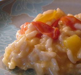 Preparazione del riso: preparate il ragù di animella sbollentando l’animella e pulendola dalla pellicola che la ricopre, tagliandola a pezzetti e cucinandola nel fondo bruno. Preparate un brodo al pepe mettendo in infusione una manciata dei tre tipi di pepe nel bordo di carne bollente. In una casseruola tostate il riso Vialone nano con una noce di burro e portatelo a cottura bagnandolo con il brodo al pepe bollente. Quando il riso è cotto togliete dal fuoco e mantecate con il burro crudo rimasto e il grana padano grattugiato. Aggiungete del pepe macinato e aggiustate di sale. Il risotto deve risultare molto cremoso.